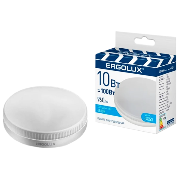 Светодиодная лампа ERGOLUX GX53 мощностью 10Вт и световой температурой 4500К идеально подходит для освещения жилых и рабочих помещений. Световой поток 960лм, размер лампы 73*26.