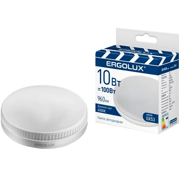 Светодиодная лампа Ergolux LED-GX53-10W-GX53-6K мощностью 10Вт и цветовой температурой 6500К. Высокий световой поток 960 лм. Светодиодная лампа ERGOLUX может быть применена в жилых, офисных и производственных в помещениях, а также в уличных светильниках со степенью защиты не менее IP54.