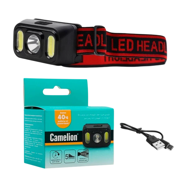 Фонарь налобный Camelion LED53417 3W XPE+2COB от аккумулятора Type-C 5 режимов черный (1/12/240)