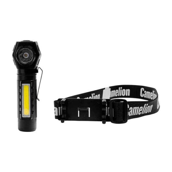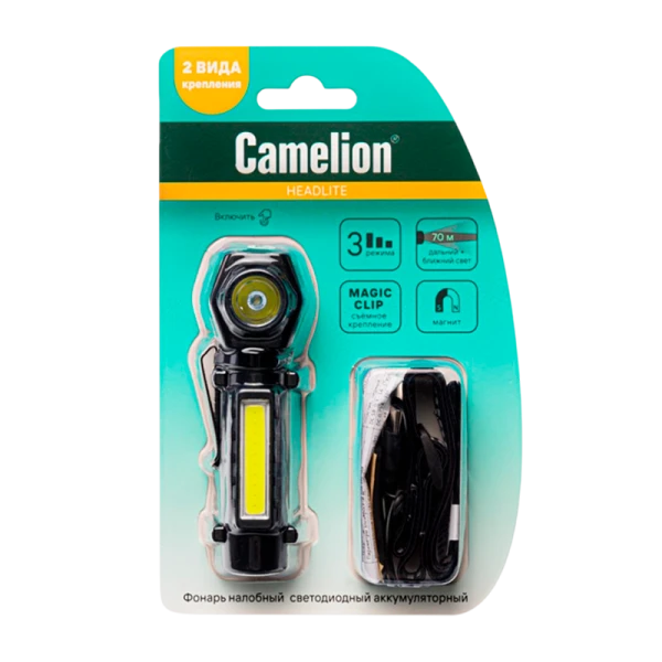 Фонарь налобный Camelion LED53409 светодиодный аккумуляторный универсальный с двумя видами крепления - для использования в качестве налобного (кронштейн Magic Clip) и ручного накарманного, а также в качестве мини-светильника.