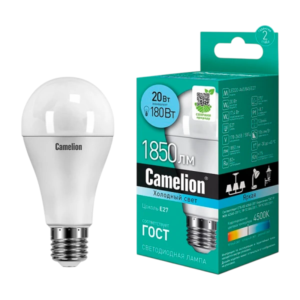 Ссветодиодная лампа Camelion LED20-A65/845/E27 для освещения помещений. Мощность 20Вт, световой поток 1850лм, цветовая температура 4500K, форма колбы груша.