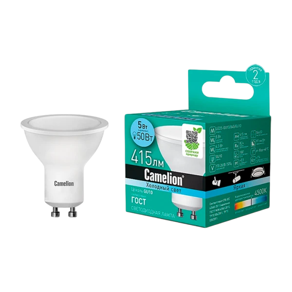 Светодиодная лампа Camelion LED5-GU10/845/GU10 мощностью 5 Вт отлично подходит для освещения жилых, офисных и коммерческих помещений. Световая температура лампы 4500 K обеспечивает приятный белый свет.