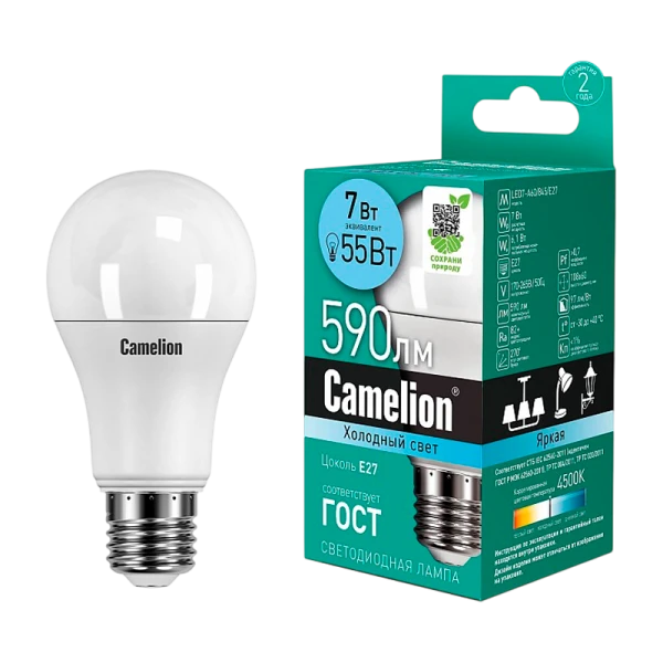 Светодиодная лампа Camelion LED7-A60/845/E27 мощностью 7Вт подходит для различных помещений. Обеспечивает яркий свет 4500К и световой поток 590 лм. СДЛ Camelion - это инновационное решение, разработанное на основе новейших светодиодных технологий (LED). Предназначена для освещения жилых, офисных и коммерческих помещений. Встроенный источник питания позволяет использовать СДЛ Camelion в стандартных патронах.