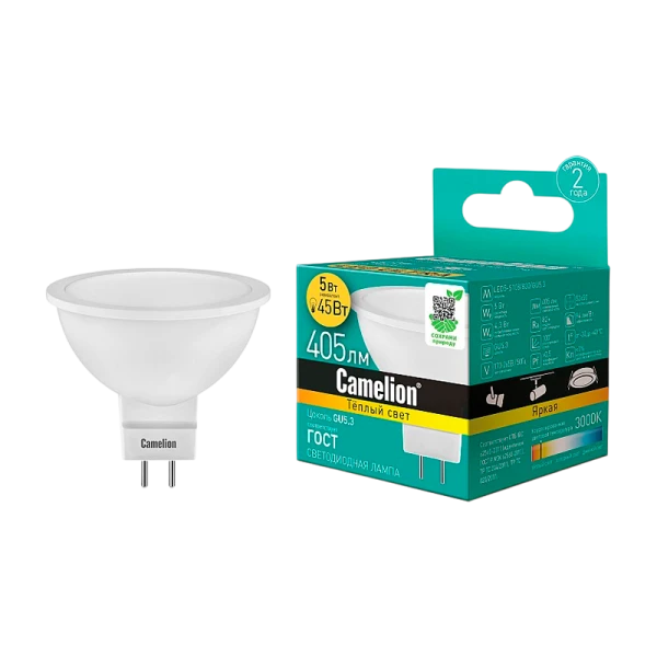 Светодиодная лампа Camelion LED5-S108/830/GU5.3 мощностью 5Вт идеальна для жилых, офисных и коммерческих помещений.