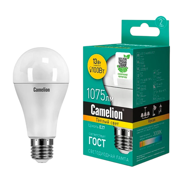 Светодиодная лампа Camelion LED13-A60/830/E27 мощностью 13Вт, 3000K. Идеально подходит для освещения жилых и коммерческих помещений. СДЛ Camelion - это инновационное решение, разработанное на основе новейших светодиодных технологий (LED). Предназначена для освещения жилых, офисных и коммерческих помещений. Встроенный источник питания позволяет использовать СДЛ Camelion в стандартных патронах.