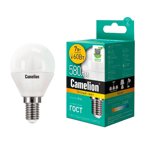 Светодиодная лампа Camelion LED7-G45/830/E14 - инновационный продукт для освещения жилых и коммерческих помещений с мощностью 7Вт и цоколем E14.