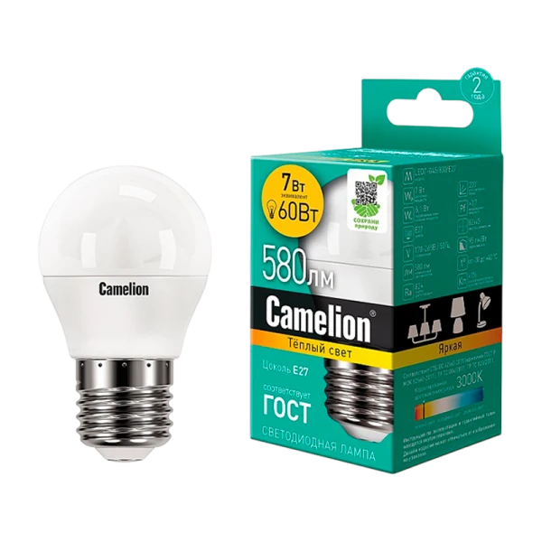 Светодиодная лампа Camelion LED7-G45/830/E27 мощностью 7 Вт и теплым светом (3000K) идеально подходит для освещения жилых и офисных помещений.