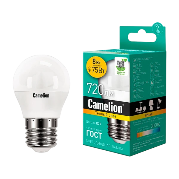 Camelion LED8-G45/830/E27 - качественная светодиодная лампа мощностью 8 Вт. Идеальна для домашних светильников, обеспечивает мягкий белый свет 3000K и яркость 720 лм.
