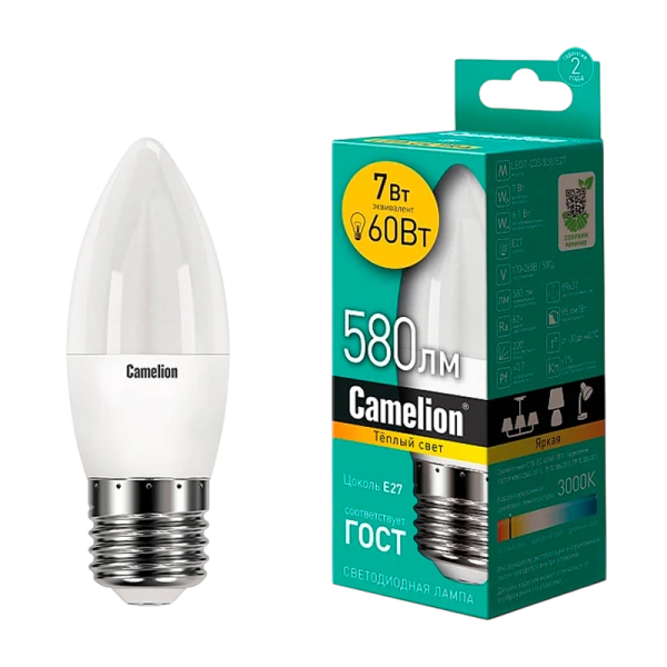 Светодиодная лампа Camelion LED7-C35/830/E27 мощностью 7 Вт идеальна для офисного и коммерческого освещения.