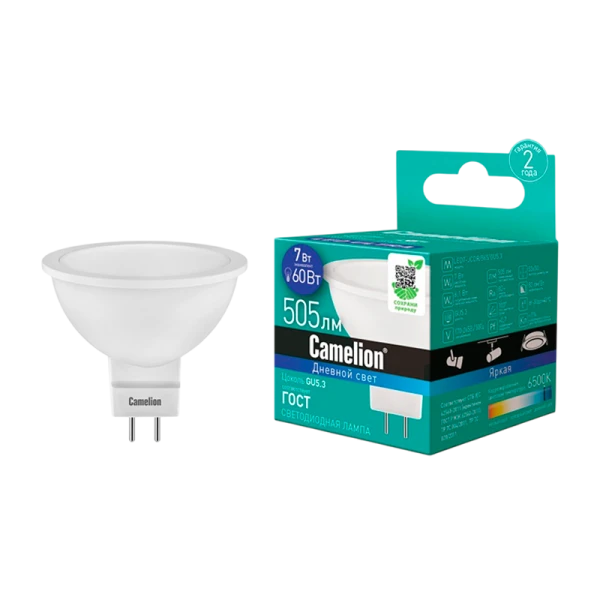 Лампа светодиодная Camelion LED7-JCDR/865/GU5.3 устанавливается во встраиваемые светильники подвесных или натяжных потолков для постоянного освещения жилых и офисных помещений. В качестве точечной подсветки используется в корпусной мебели или каркасных перегородках интерьера.