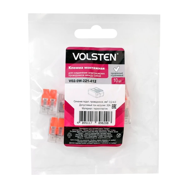 Строительно-монтажная клемма Volsten V02-9W-221-412 2 пр. до 4 мм, 32А, 450 В, 10 шт., оранжевый