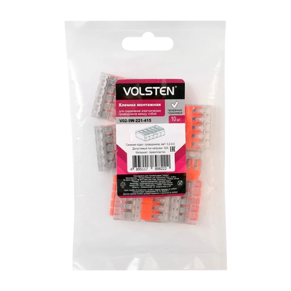 Строительно-монтажная клемма Volsten V02-9W-221-415 5 пр. до 4 мм, 32А, 450 В, 10 шт., оранжевый