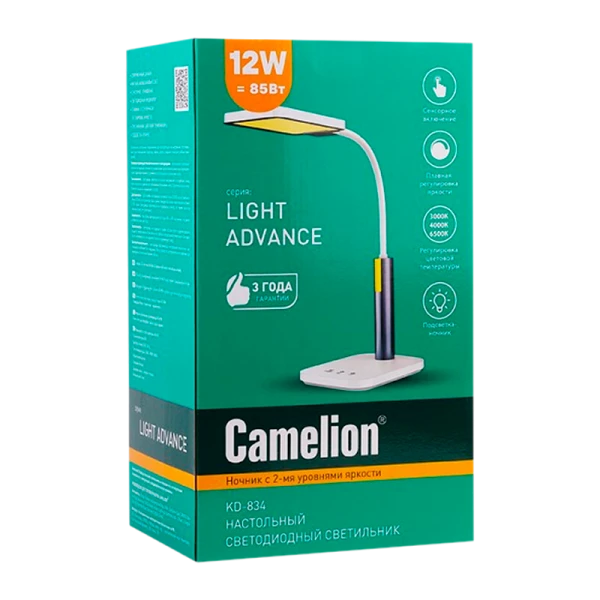 Уникальный светильник CAMELION KD-834 C08 качества Премиум. Максимальная высота плафона над уровнем стола 420 мм. Превосходная модель для использования в офисе, дома, в учебных заведениях. Плафон - пластик, стойка – металл в силиконовой оболочке, основание – пластик. Три сенсорных выключателя на основании светильника: 1-Вкл/ Выкл; 2-кнопка регулирования яркости (долгое нажатие) и переключения цветовой температуры (короткое нажатие); 3-кнопка включения ночника и регулировки его яркости.
