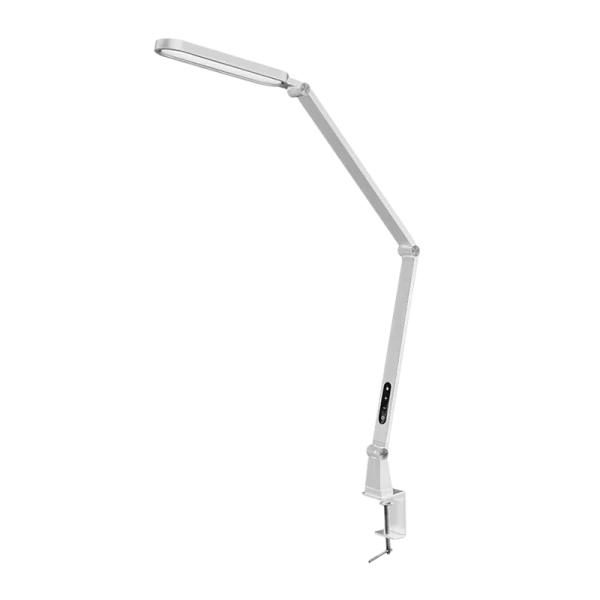 Светодиодный настольный светильник на струбцине Camelion KD-860 класса премиум может использоваться в качестве источника местного освещения как в домашних помещениях, так в офисных и учебных учреждениях. Очень мощный (13 Вт), яркий (850 лм- макс.), с высоким индексом цветопередачи ( Ra > 85) имеет пять уровней регулировки яркости и пять режимов цветовой температуры (от 3000К до 6000К). Сенсорная панель управления световыми режимами находится на нижней части стойки. Изящная прочная двухзвенная стойка изготовлена из алюминия. Мощная металлическая струбцина надежно фиксирует светильник на любой поверхности толщиной до 6,5 см. Стойка имеет возможность поворота на 60 градусов ( по 30 град в обе стороны вокруг центральной оси). Пластиковый плафон длиной 24 см имеет вытянутую форму. Максимальная высота плафона над уровнем стола в рабочем положении ~ 70 см. Длина провода питания – 150 см.
