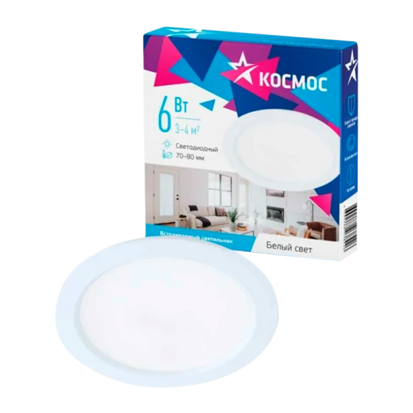 Светодиодная панель, круглая, цвет белый, КОСМОС DownL 6W, 180-265В, 4000K (KDownL6W4000K)