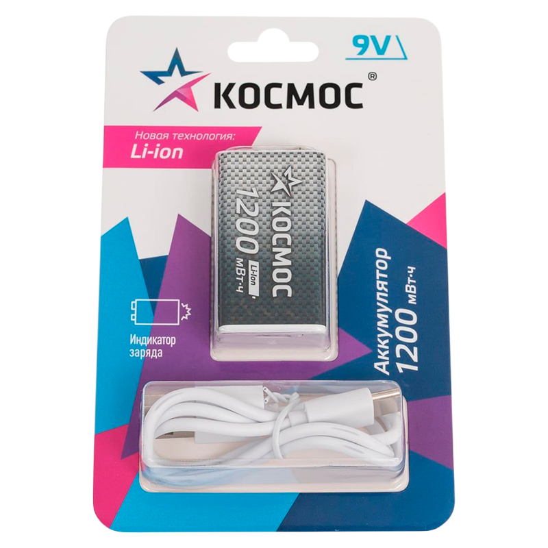 Аккумулятор бытовой Космос Крона BL1 Li-ion 9V 1200mAh Type-C (1/6/72)