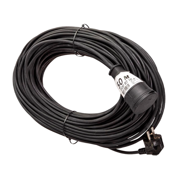 Силовой удлинитель в виде шнура, с одного конца литая вилка с другого конца прорезиненное гнездо с заземлением и защитной крышкой. Идеальный вариант для подключение садовой и рабочей техники на удалении в любых условиях. Черный кабель КГ (Кабель гибкий) – это кабель силовой очень гибкий с изоляцией и оболочкой из резины. Морозоустойчив до -40 градусов и максимальной мощностью нагрузки 3500Вт. 50м, 10А, IP44, КГ 2х1мм.