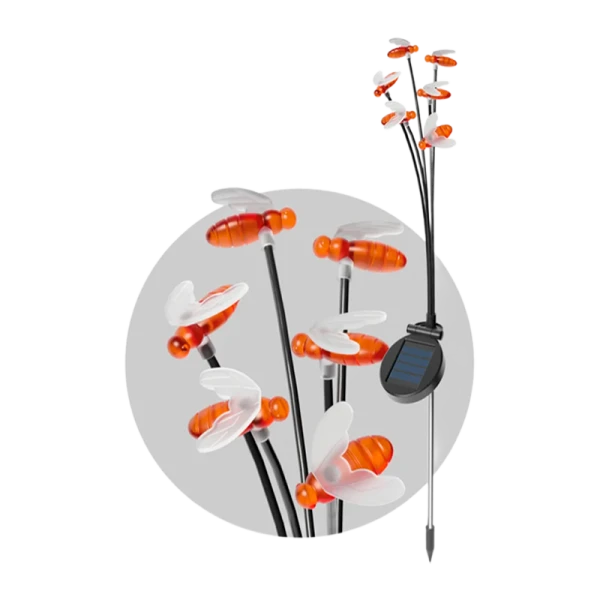 Светильник на солнечной батарее со светодиодными пчелками дополнит ваш цветник или любимый уголок сада. Пчёлки расположены на гибких проводах и покачиваются от ветра. Работает автономно: солнечная панель заряжает аккумулятор в течении всего светового дня (зарядка во включенном состоянии), датчик освещенности включает светильник с наступлением темноты.