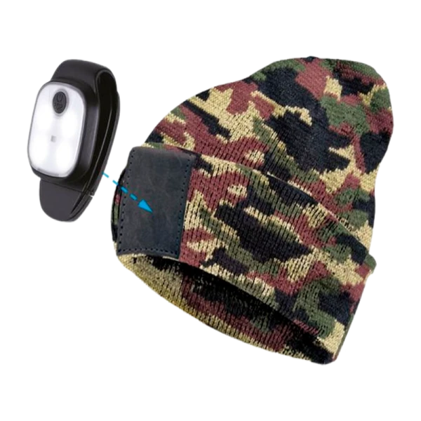 Шапка со съёмным LED-фонариком. Цвет - камуфляж. Фонарик работает до 5 часов без подзарядки, и легко снимается с шапки: благодаря клипсе его можно закрепить на велосипед, собачий ошейник (для этого есть режим красного мигания) или на другую одежду.