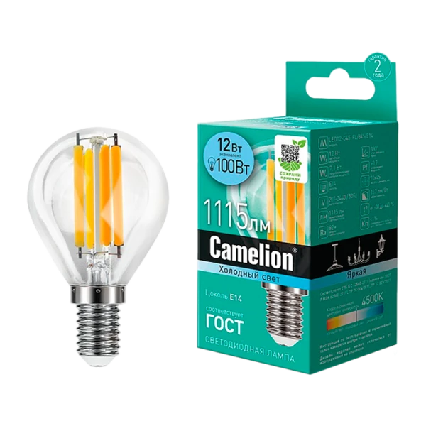 Camelion LED12-G45-FL/845/E14 - это инновационное решение, разработанное на основе новейших светодиодных технологий (LED). Предназначена для освещения жилых, офисных и коммерческих помещений. Встроенный источник питания позволяет использовать СДЛ Camelion в стандартных патронах.