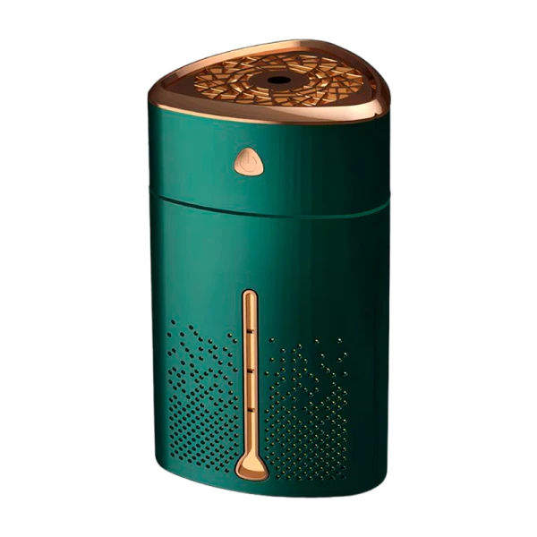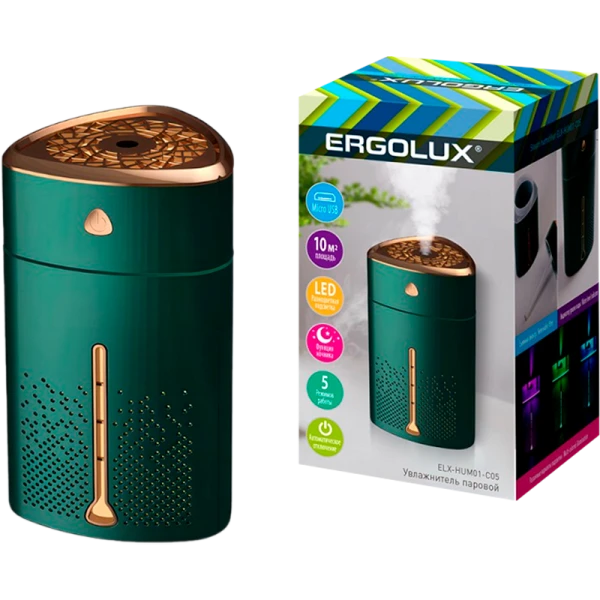 ультразвуковой увлажнитель воздуха Ergolux ELX-HUM01-C05 в зелено-золотом цвете. Обладает мощностью 5Вт и вместительным резервуаром объемом 1000 мл. Устройство оснащено 5 режимами работы, что позволяет выбрать оптимальный режим в зависимости от условий использования. Кроме того, увлажнитель имеет функцию подсветки и может использоваться как ночник. Благодаря интенсивному увлажнению, устройство способно поддерживать комфортный микроклимат в помещении площадью до 10 квадратных метров.