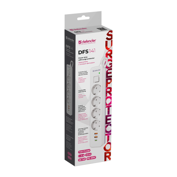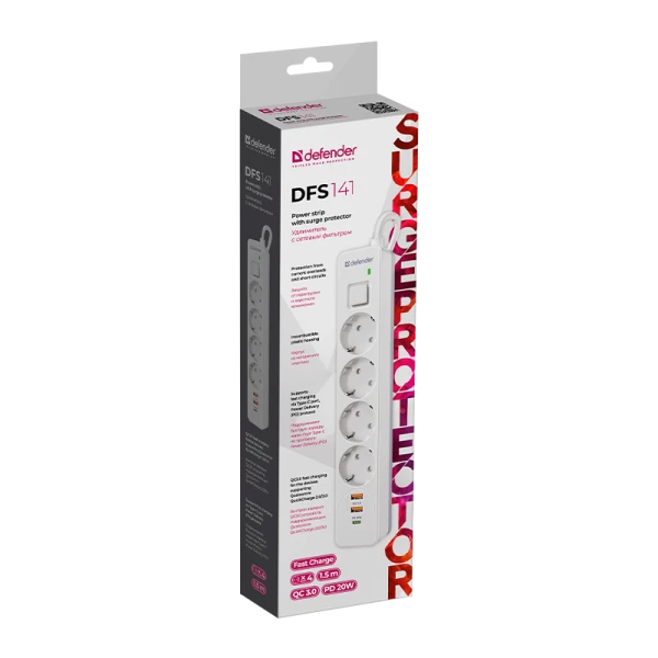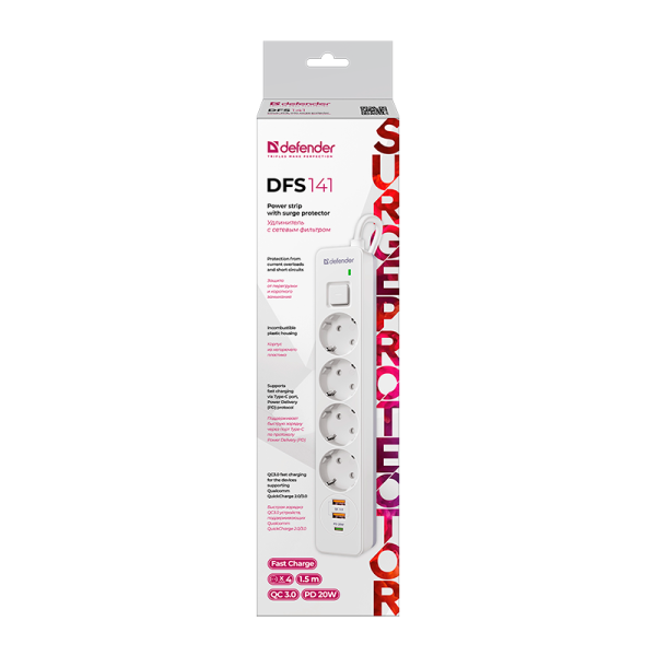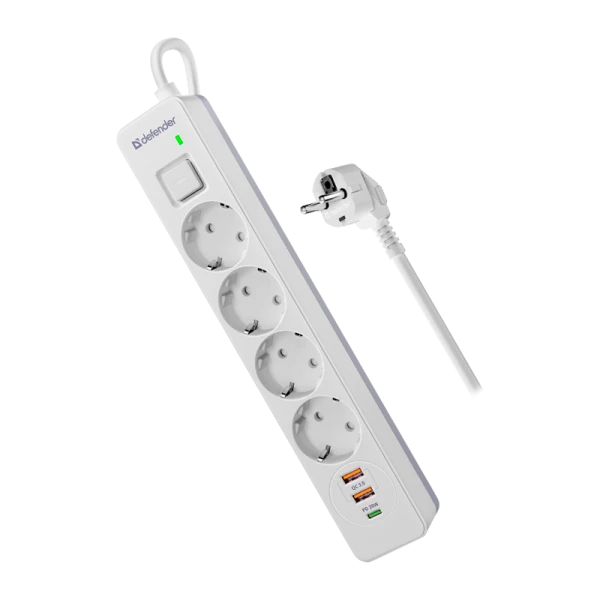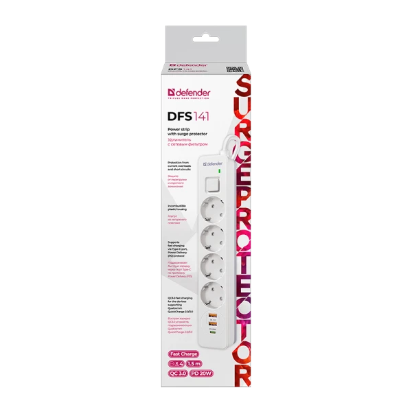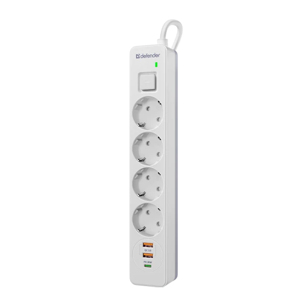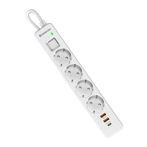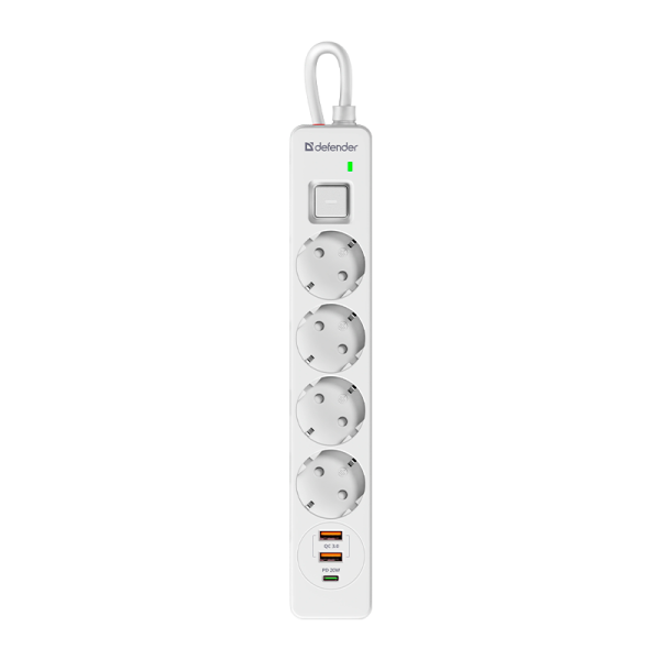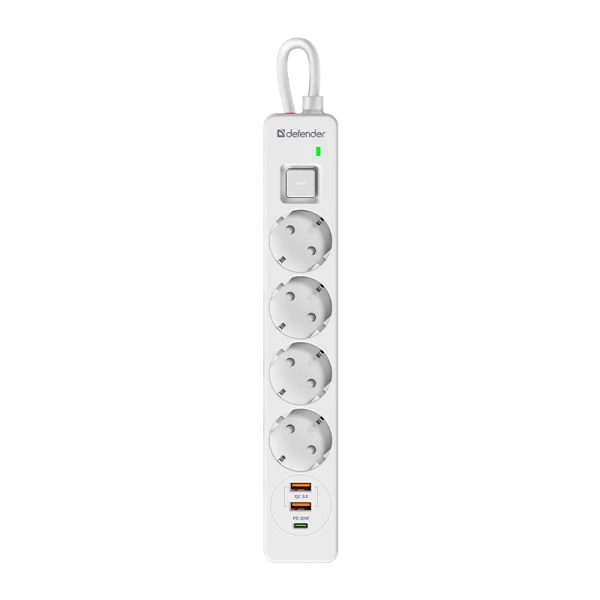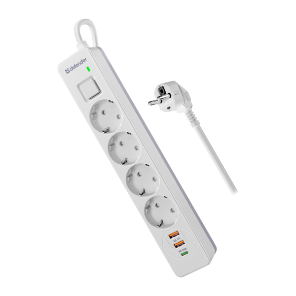 Сетевой фильтр Defender DFS 141 4р.С/З 16A 1.5м 2USB+Type-C 380 Дж белый (1/30)