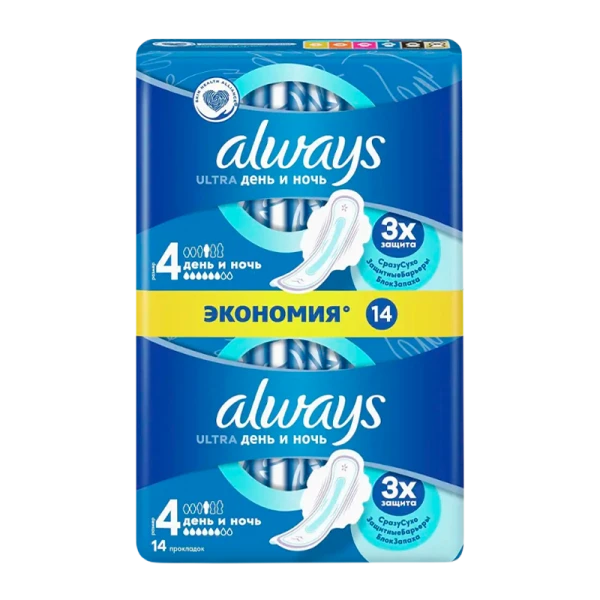 Тройная защита от Always — не соглашайтесь на меньшее: в Always Ultra День и Ночь (Размер 4) с крылышками используется новейшая технология для создания многофункциональной гигиенической прокладки с 3 элементами защиты в дневное и ночное время. Система «Сразу сухо» впитывает влагу за считаные секунды и не дает ей соприкасаться с кожей. Технология «Защитные барьеры» удерживает жидкость, предотвращая протекания. Технология «Блок запаха» нейтрализует неприятные запахи, придавая ощущение свежести и чистоты во время менструации. С Always Ultra вы можете чувствовать себя уверенно весь день. Тройная защита от Always — не соглашайтесь на меньшее!