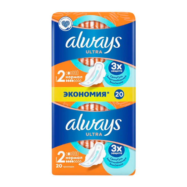 Тройная защита от Always — не соглашайтесь на меньшее: в Always Ultra Normal (Размер 2) с крылышками используется новейшая технология для создания многофункциональной гигиенической прокладки с 3 элементами защиты. Система «Сразу сухо» впитывает влагу за считаные секунды и не дает ей соприкасаться с кожей. Технология «Защитные барьеры» удерживает жидкость, предотвращая протекания. Технология «Блок запаха» нейтрализует неприятные запахи, придавая ощущение свежести и чистоты во время менструации. С Always Ultra вы можете чувствовать себя уверенно весь день. Тройная защита от Always — не соглашайтесь на меньшее!