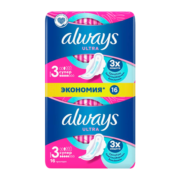 Прокладки женские гигиенические Always Ultra Super с верхним слоем Драй-вив (сеточкой), благодаря которому поверхность прокладок остается практически сухой и чистой. Тонкие Always Ultra более незаметны, чем прокладки обычной толщины, и очень комфортны в использовании. Уникальные эластичные крылышки обеспечивают надежную защиту по краям. Отлично защищают в дни наиболее интенсивных выделений. Технология «Блок запаха» нейтрализует неприятные запахи, придавая ощущение свежести и чистоты во время менструации. С Always Ultra вы можете чувствовать себя уверенно весь день. Тройная защита от Always — не соглашайтесь на меньшее!