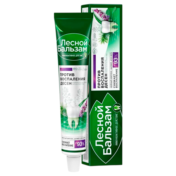 Зубная паста Лесной Бальзам с натуральными экстрактами шалфея, алоэ вера, живицы и можжевельника. Зубная паста обладает мощным противовоспалительным действием. Насыщенный хвойный вкус. Содержит хвойный комплекс (на основе экстрактов пихты, живицы, можжевельника) с отваром 5 целебных трав, экстрактом шалфея и соком алоэ. Богатый натуральный состав способствует снижению воспаления и отечности десен, блокирует развитие воспалительного процесса и стимулирует восстановление мягких тканей полости рта.