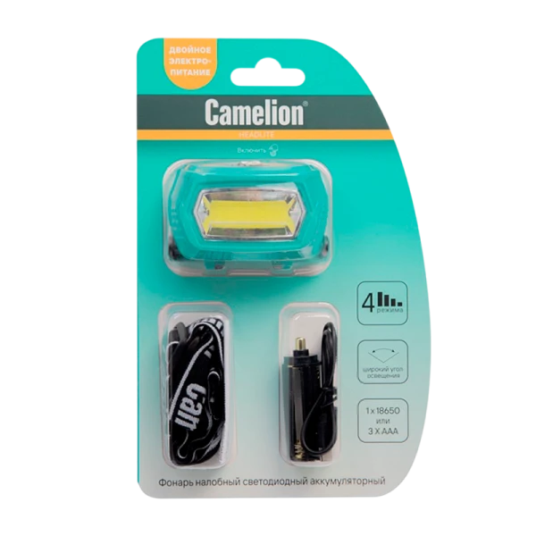 Светодиодный налобный фонарь Camelion LED53411 оснащен аккумулятором на 3,7В и способен работать как от него, так и от обычных батареек типа 3 x AAA. Обладает ярким светом благодаря технологии COB и имеет три режима работы.