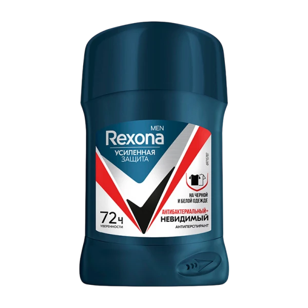 Дезодорант-антиперспирант стик Rexona Men Невидимый на черной и белой одежде с технологией двойной защиты: нет поту, нет запаху, нет белым следам на черном и желтым пятнам на белом. В его формуле достигнут оптимальный баланс: концентрация активного компонента делает формулу невидимой на коже и одежде и обеспечивает в 10 раз более эффективную защиту против бактерий, вызывающих неприятный запах, а также бережно относится к нежной коже подмышек.