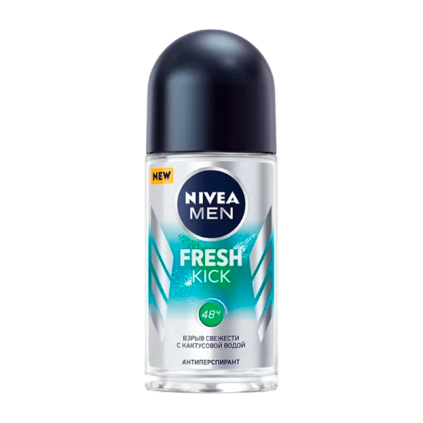 Главным компонентом свежести нового антиперспиранта является кактусовая вода, которая вместе с другими ингредиентами дает ощущение свежести как после душа в жаркий день и обеспечивает деликатный уход без раздражения кожи. Стойкий аромат свежести будет с тобой весь день. Шариковый дезодорант-антиперспирант даёт в 2 раза больше применений, чем спрей! Будь естественно свеж вместе с Nivea MEN Fresh Kick! Применение: наносить ежедневно на сухую чистую кожу подмышек.