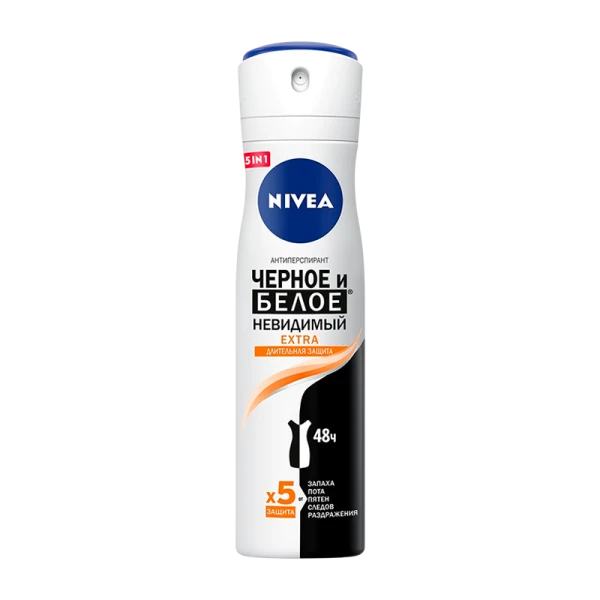 Дезодорант-антиперспирант спрей Nivea Черное и Белое Невидимый Extra предотвращает появление белых пятен на темной одежде и желтых пятен на светлой одежде. Черная одежда остается черной, а белая одежда дольше остается белой. Уникальная формула Nivea имеет 5 факторов защиты: от запаха, пота, пятен, следов и раздражения. Защищает кожу подмышек в течение 48 часов от пота и неприятного запаха. Этот чистый, кристальный и яркий сладковатый аромат - выражение естественной женственности. Не содержит этилового спирта. Сильная защита и забота о коже от Nivea на каждый день!