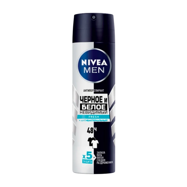 Дезодорант-антиперспирант спрей NIVEA MEN Черное и Белое Невидимый Fresh предотвращает появление белых пятен на темной одежде и желтых пятен на светлой. Черная одежда остается черной, а белая одежда дольше остается белой. Уникальная формула Nivea имеет 5 факторов защиты от: запаха, пота, пятен, следов и раздражения. Защищает кожу подмышек от неприятного запаха в течение 48 часов и обладает антибактериальным эффектом, который препятствует размножению бактерий, вызывающих неприятный запах. Не содержит этилового спирта. Настоящий мужской аромат для ощущения чистоты и свежести на весь день. Сильная защита и забота о коже от NIVEA на каждый день! Применение: хорошо встряхнуть перед использованием. Распылять в области подмышек с расстояния 15 см. Дать полностью высохнуть во избежание образования пятен на одежде.