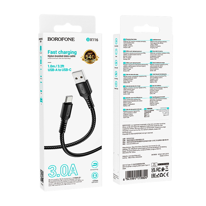 Кабель Borofone BX116 USB (m)-Type-C (m) 1м 3.0A черный (1/360)