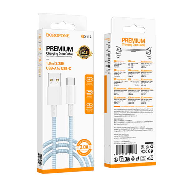 Кабель Borofone BX117 USB (m)-Type-C (m) 1м 3.0A нейлон синий.