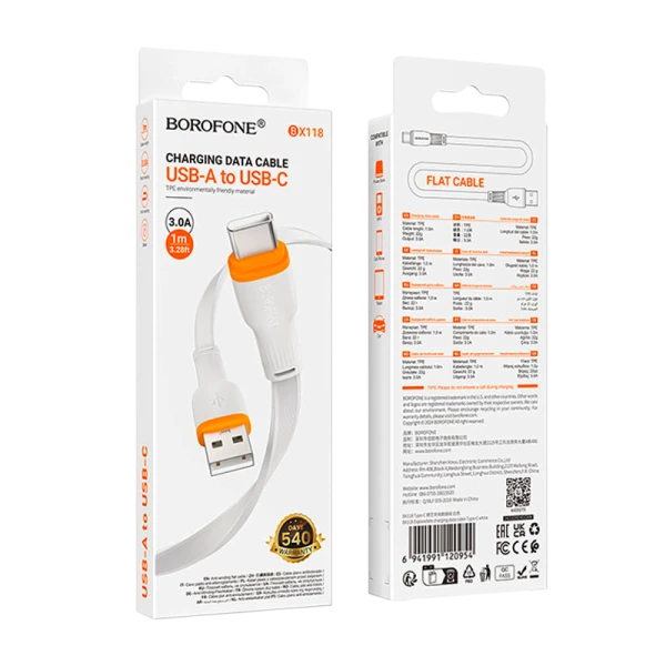 Кабель Borofone BX118 USB (m)-Type-C (m) 1м 3.0A ПВХ белый.