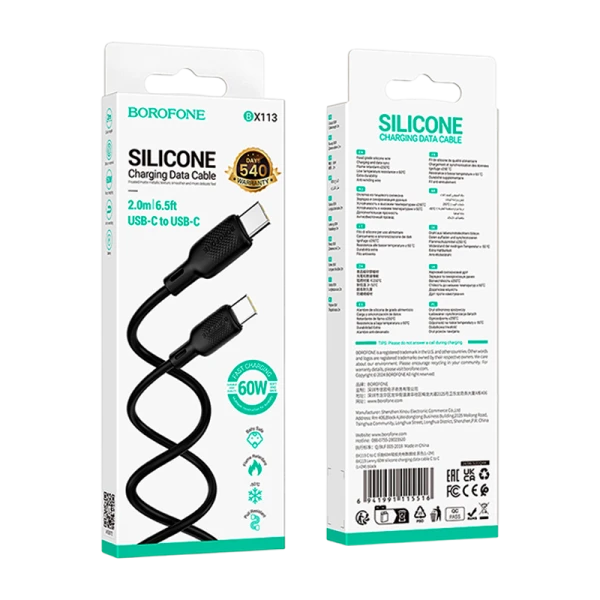 Кабель Borofone BX113 Type-C (m)-Type-C (m) 2.0м 3.0A 60W силикон черный.
