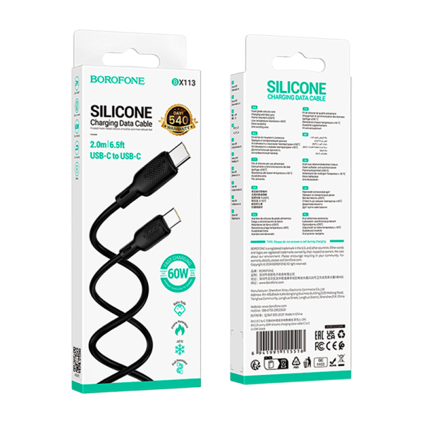 Кабель Borofone BX113 Type-C (m)-Type-C (m) 2м 3.0A 60W силикон черный (1/360)