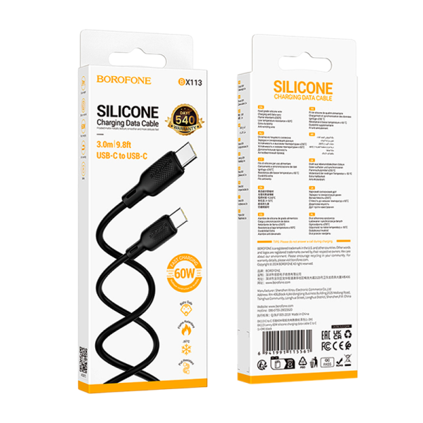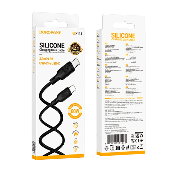 Кабель Borofone BX113 Type-C (m)-Type-C (m) 3м 3.0A 60W силикон черный.