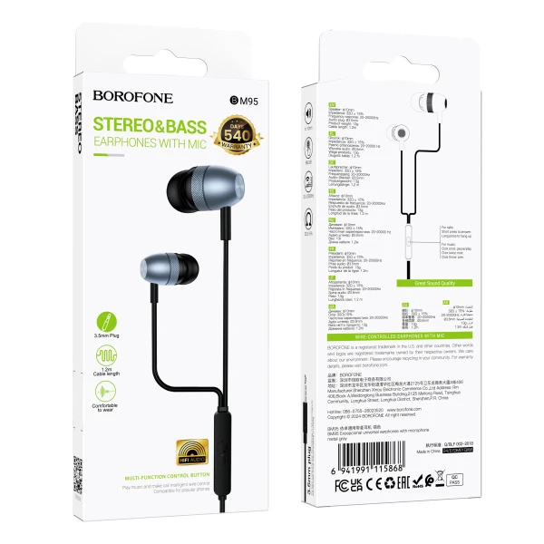 Наушники внутриканальные Borofone BM95, Excepcional, Jack 3.5мм, 1.2 м, цвет: чёрный, серебряная вставка