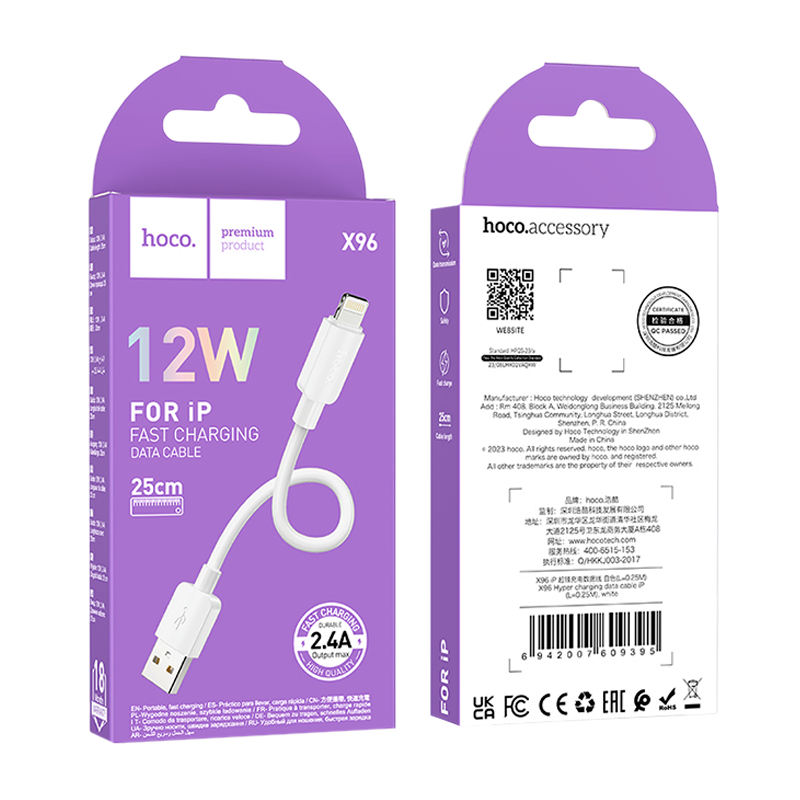 Кабель HOCO X96 Lightning (m)-USB (m) 0.25м 2.4A 12W силикон белый.