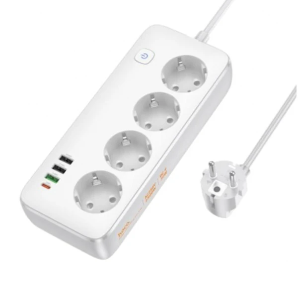 Сетевой фильтр HOCO AC22, 1.5м, 4 розетка, 3 USB, Type-C, кнопка питания, PD30W, цвет: белый
