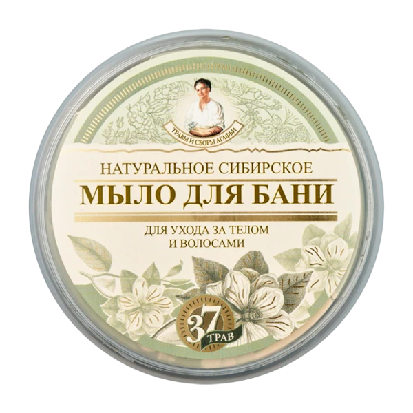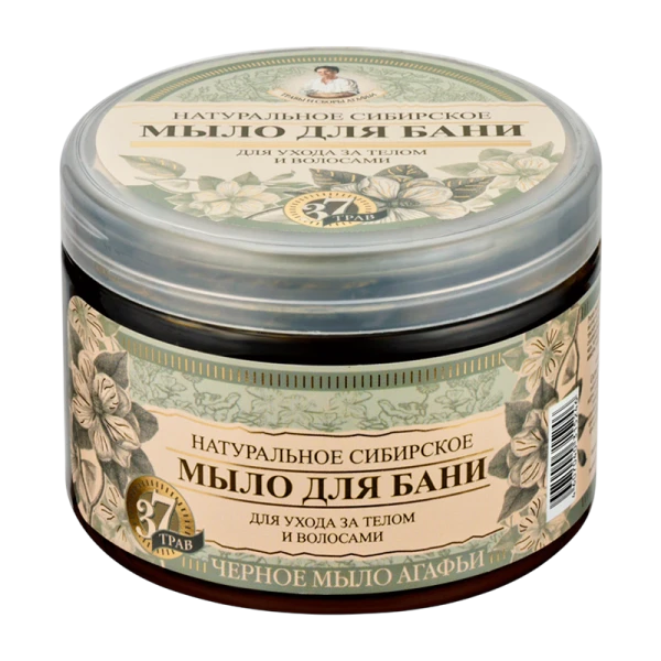 Натуральное Сибирское мыло для бани, для ухода за телом и волосами. Редкие дикие растения содержат в себе феноменальное количество витаминов и полезных веществ, поэтому их экстракты незаменимы для ухода за кожей и волосами. В состав чёрного мыла для бани от Бабушки Агафьи входит дёготь и берёзовая чага, поэтому данный продукт необычного для мыла чёрного цвета. Его можно использовать и как шампунь, и как гель для душа;