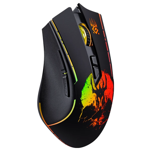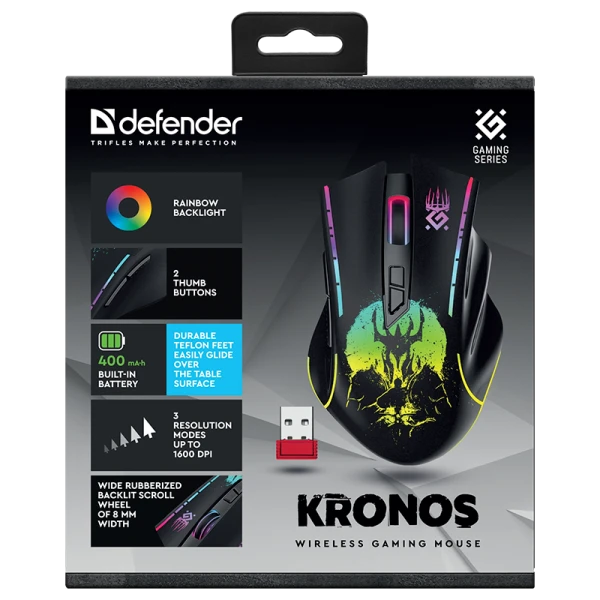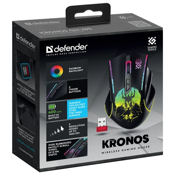 Эргономичная игровая беспроводная мышь Defender GM-695 Kronos с радужной подсветкой. Мышь имеет две дополнительные боковые кнопки, встроенный аккумулятор на 400 мАч и тефлоновые ножки для легкого скольжения по поверхности стола. Специальный отсек в корпусе мыши для хранения приемника. Программное обеспечение Defender Game Center. Работает только с операционной системой Windows.