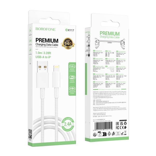 Кабель Borofone BX117 USB (m)-Lightning (m) 1м 2.4A белый (1/360)