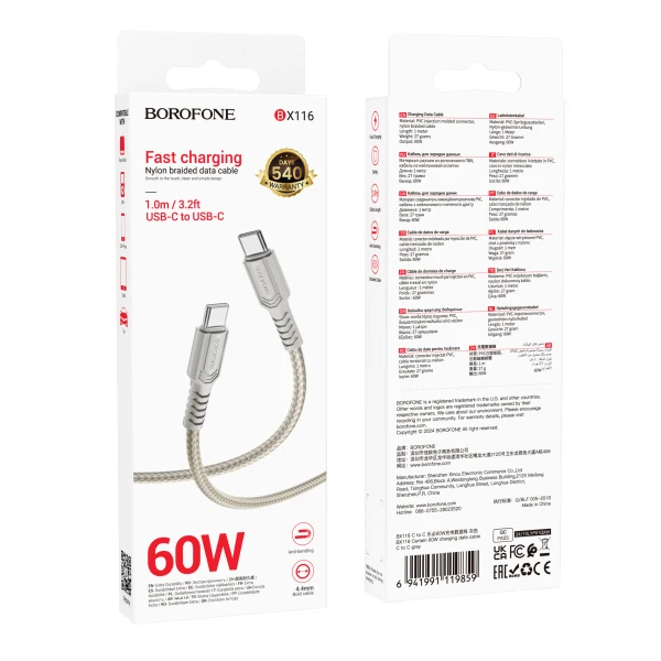 Кабель Borofone BX116 Type-C (m)-Type-C (m) 1м 3.0A 60W серый (1/360)