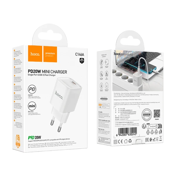 Блок питания сетевой 1 Type-C HOCO C146A, Charm, PD 20Вт, белый.