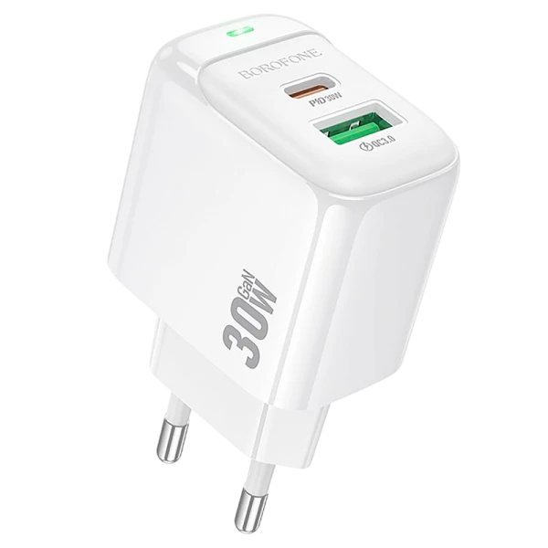Сетевое зарядное устройство Borofone BAS45A мощностью 30 Вт с портом USB-A и портом USB-C.
